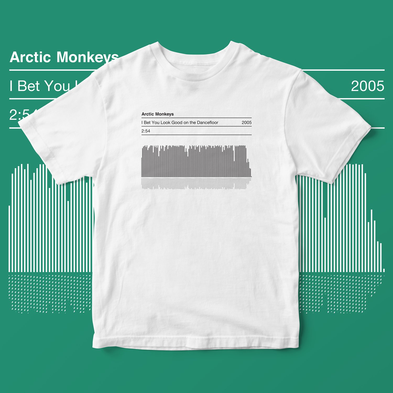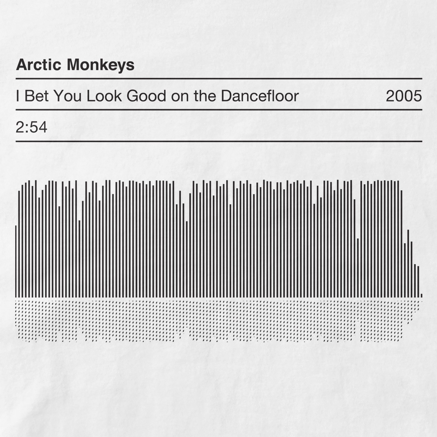 Arctic Monkeys “I Bet You Look Good on the Dancefloor” sound wave T-shirt — 100% cotton, unisex, designed by Serigrafica7585